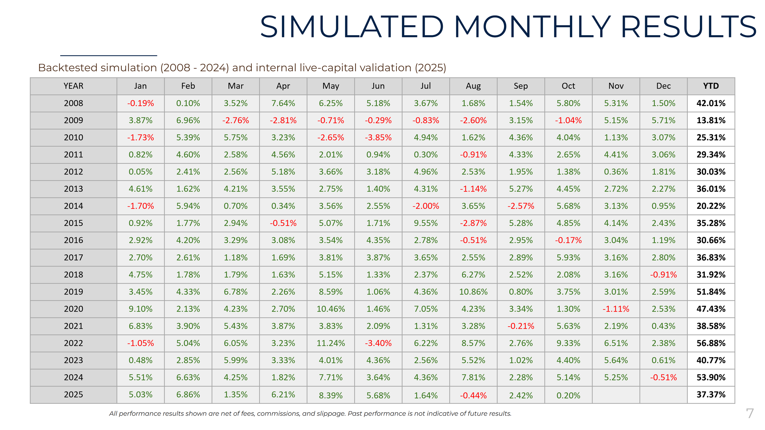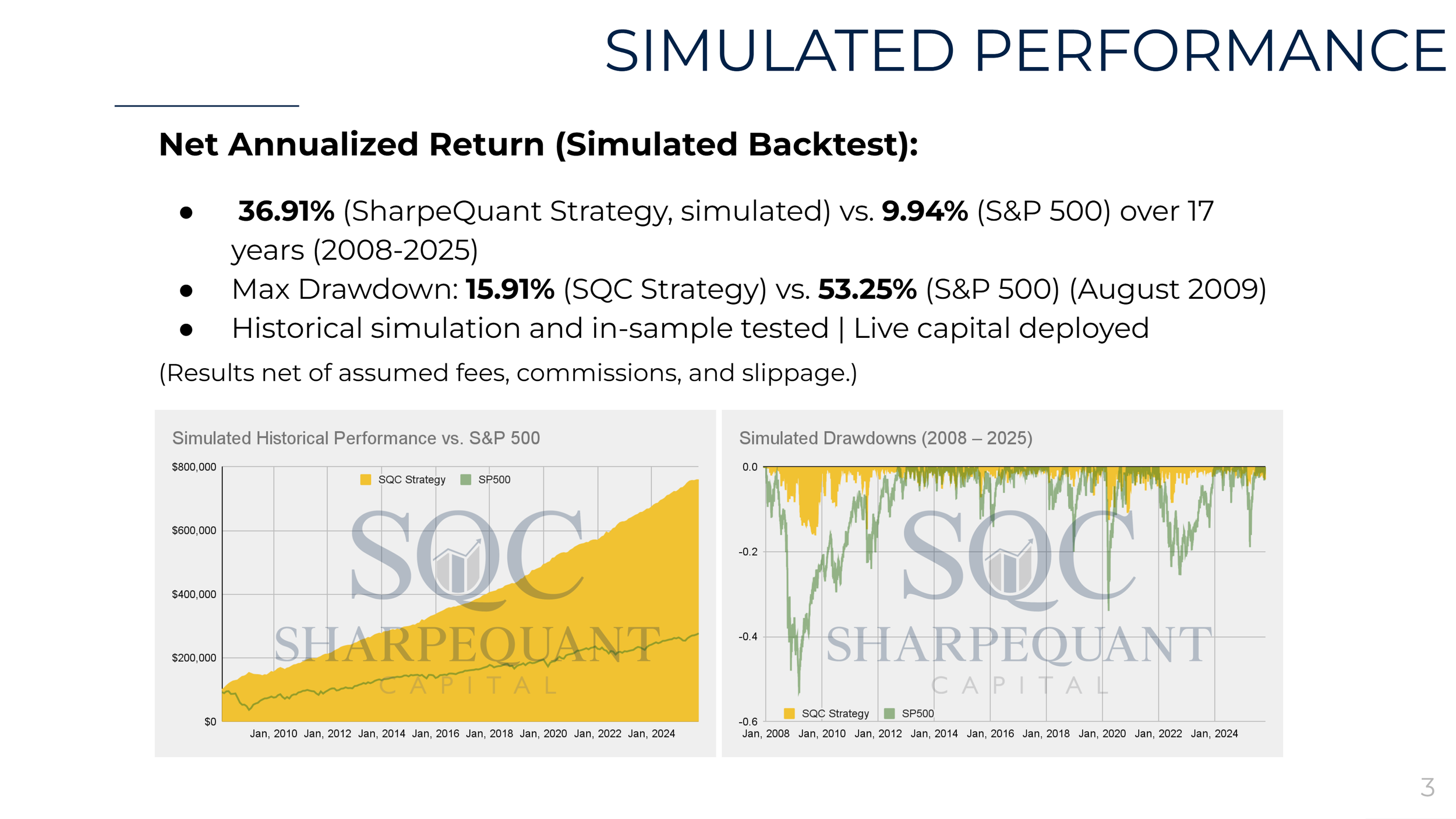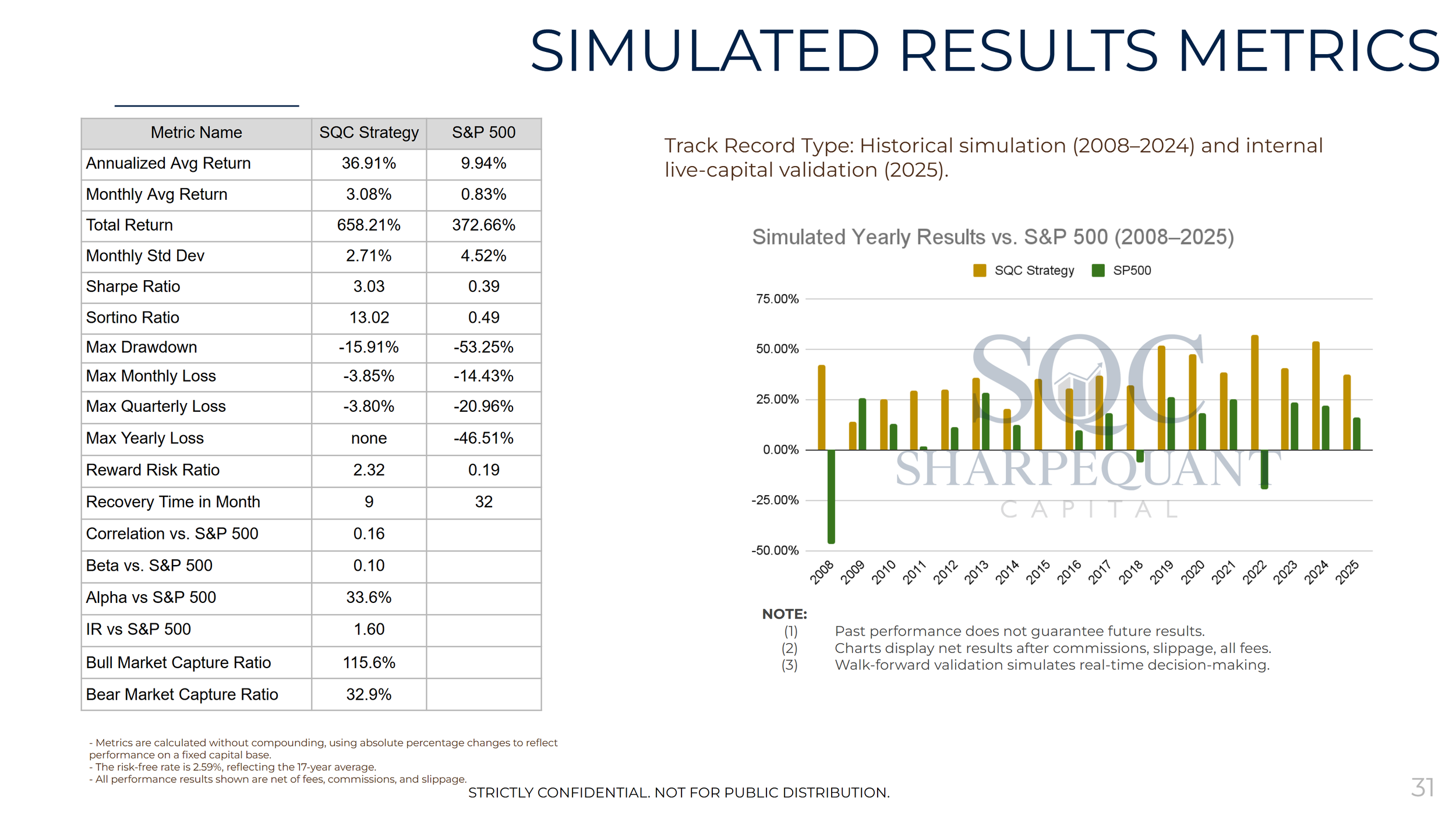 The performance results shown above are simulated and based on backtested data using SharpeQuant’s proprietary trading technology. These results are provided for illustrative and informational purposes only and do not represent the performance of any actual fund or account. Past simulated performance is not indicative of future results, and actual outcomes may differ materially. SharpeQuant does not offer investment advice or manage client assets. Fund management and investor onboarding are handled exclusively our registered Portfolio Manager and Investment Fund Manager partner.